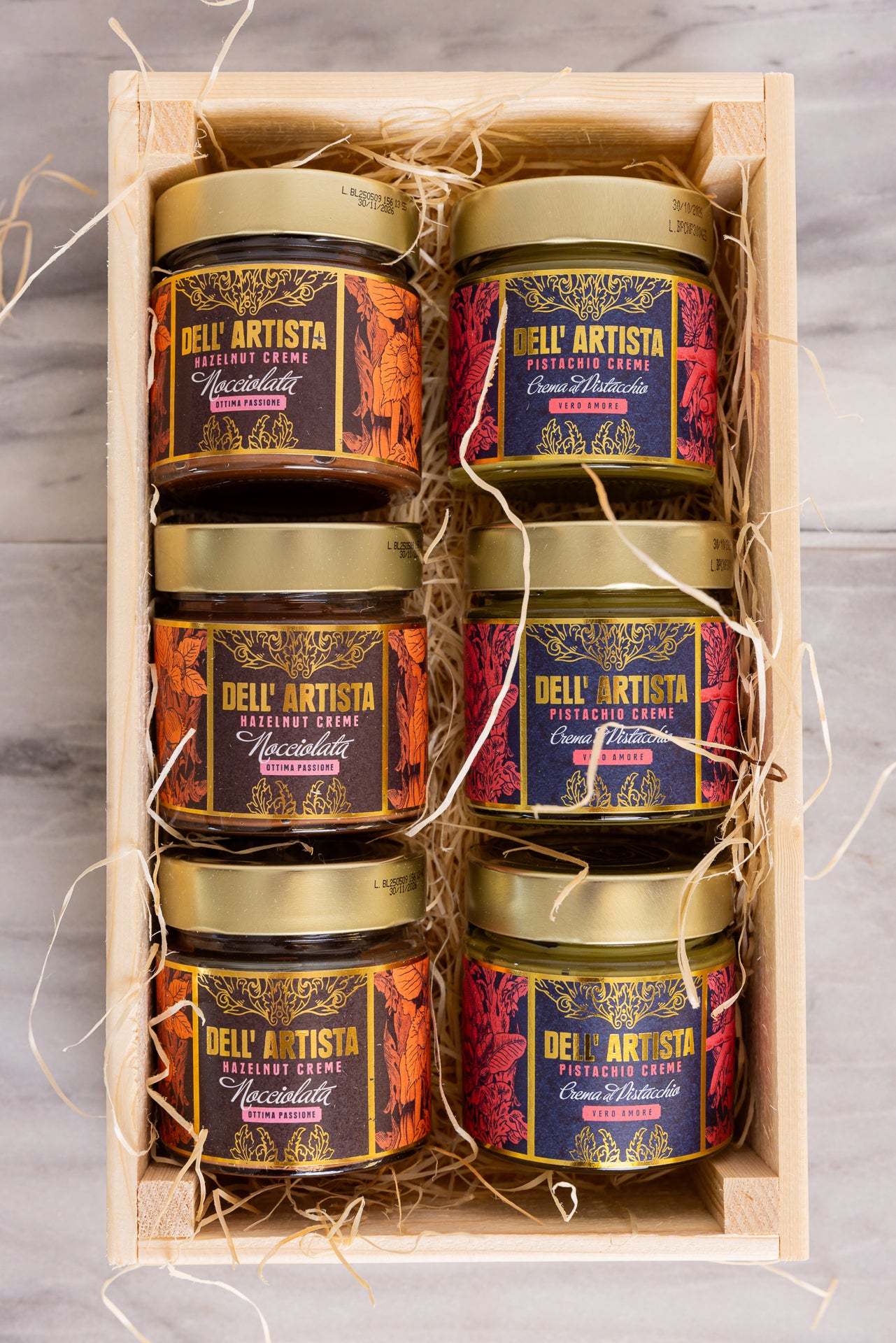 3 Hasselnötscréme och 3 Pistagecréme i Dell' Artistas trälåda