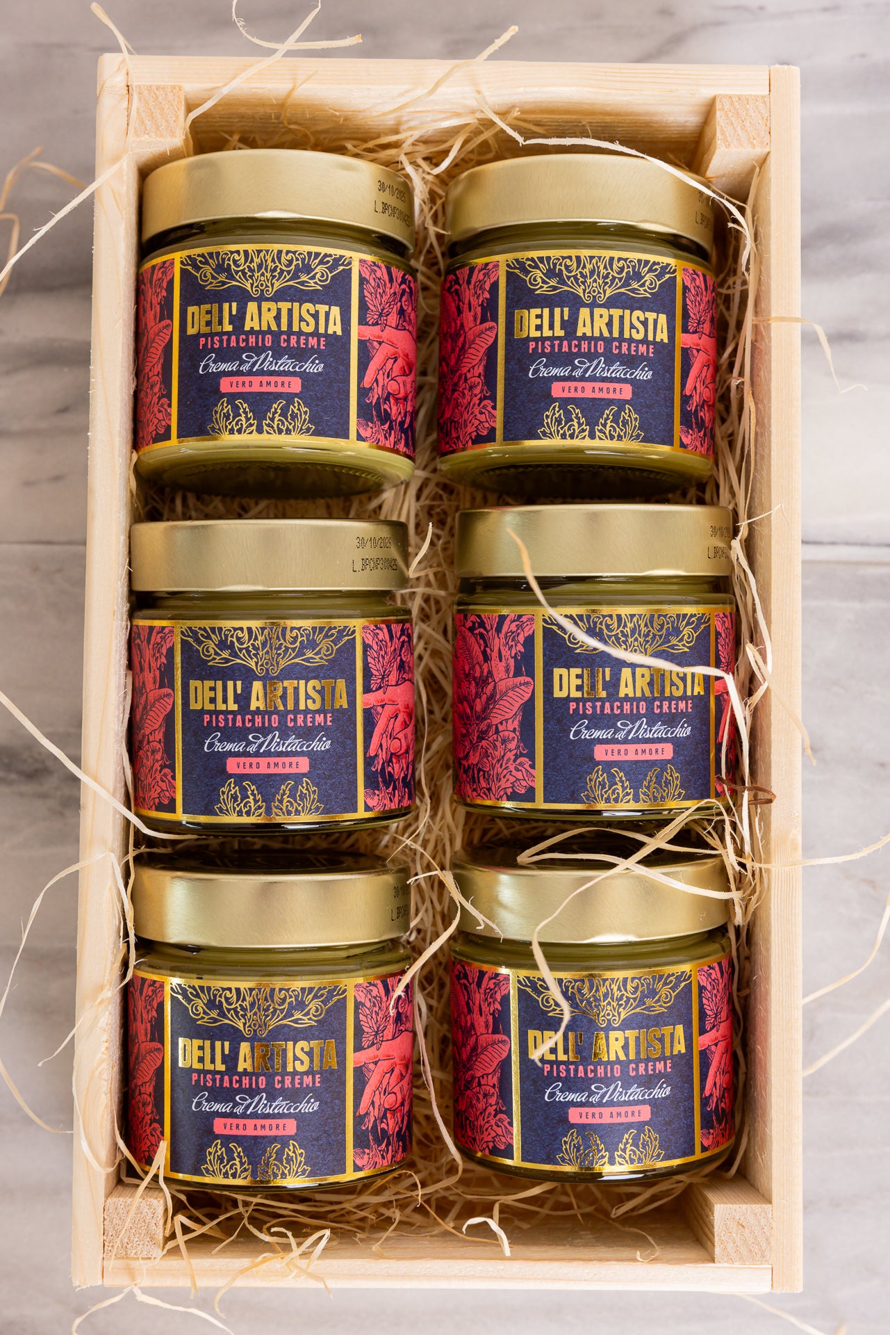 6 pack av pistagecreme i snygg och användbar trälåda.