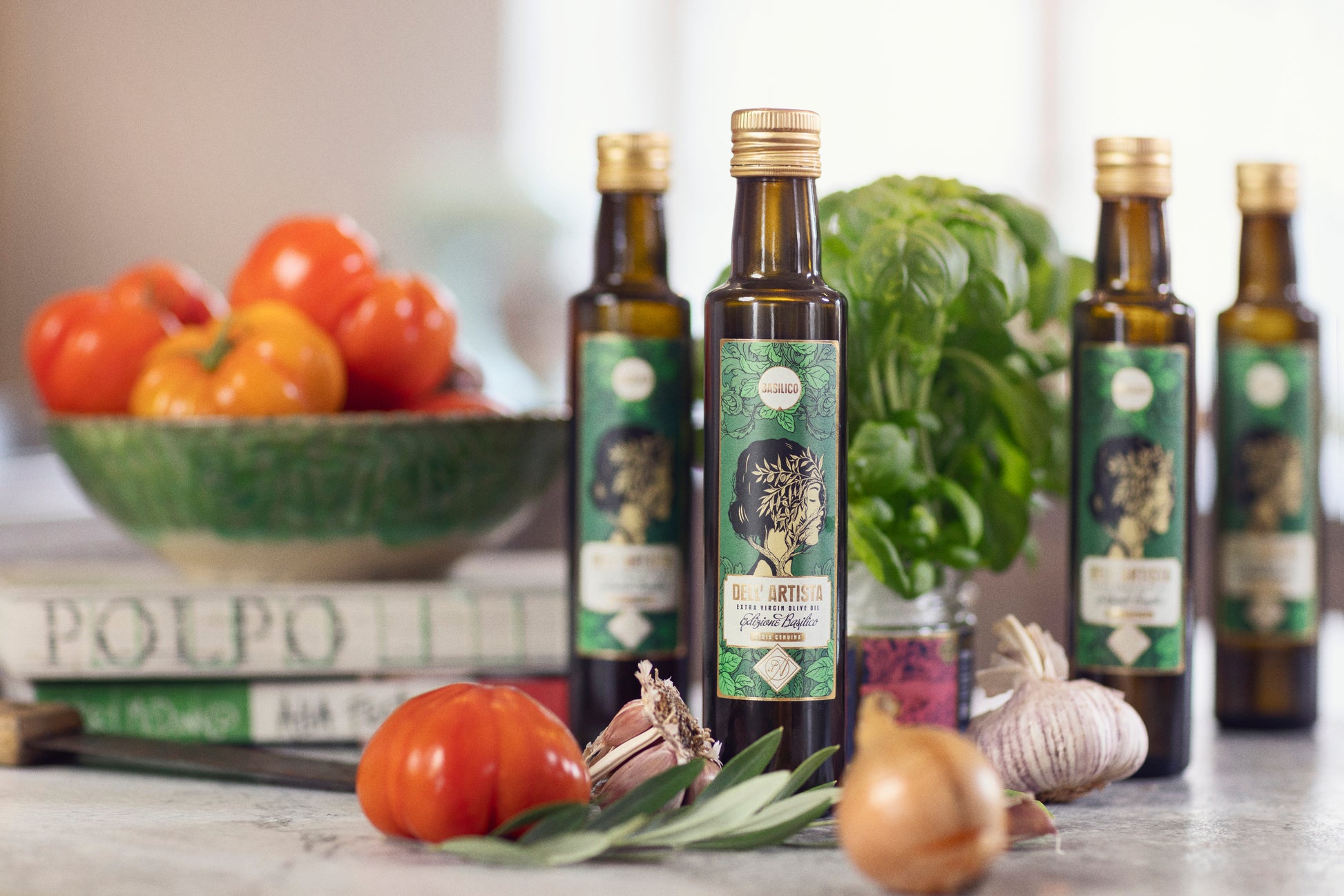 Dell’ Artista Edizione Basilico extra virgin olivolja erhållen från kallpressning av de bästa sicilianska oliverna från om rådena kring Partanna, Castelvetrano, Giuliana, Valderice och Castelluzzo. Oljan pressas med färska basilikablad. Oljan har en stark personlighet som kännetecknas av den härliga doften av färsk basilika och den delikat fruktiga smaken från olivolja.