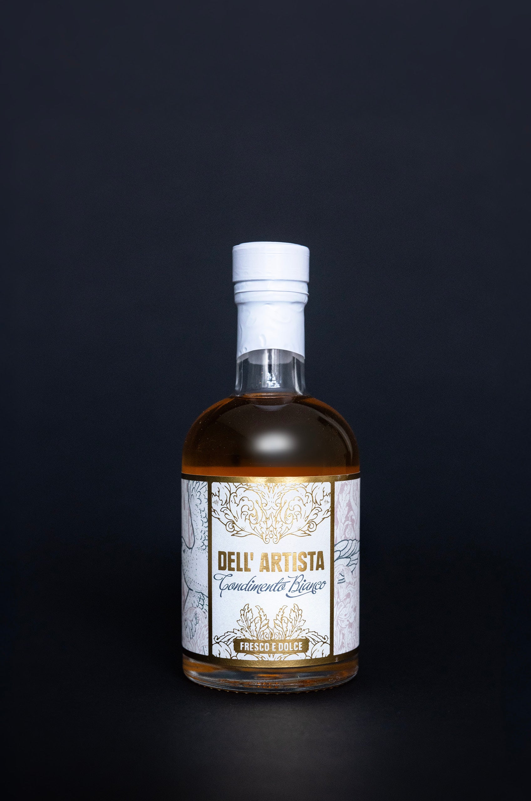Dell’ Artistas Condimento Bianco är vår variant av Balsamico Bianco, kokt vit druvmust och fin vitvinsvinäger på de bästa råvarorna för säsongen, lagrad på ekfat i Modena. Den fina konsistensen, gyllene färgen och den snyggt balanserade smaken mellan söt, fruktigt och syrligt kännetecknar den fräscha matkärleken av Italien.